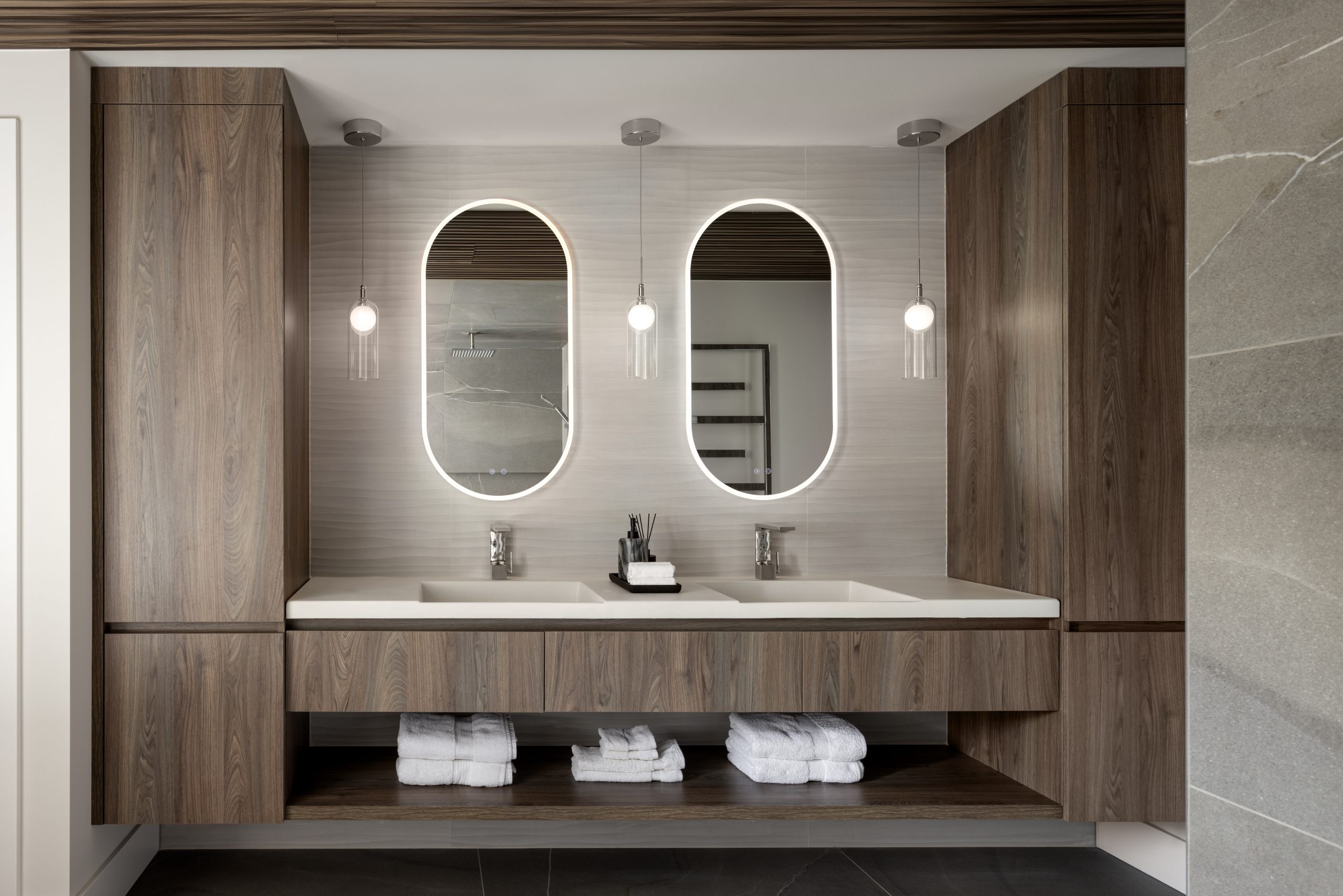 - Textures seen trending in other areas of the bath, such as fluting, can add a dimensional touch to bath mirrors and vanities.